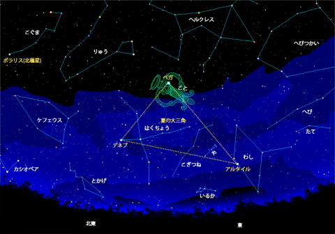 7月中旬の午後8頃には、東の空の高度60度ぐらいの所にあります。
