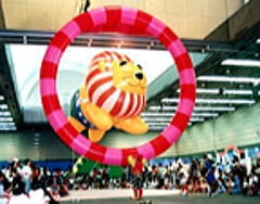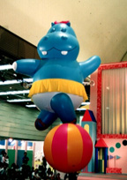 ●プリマドンナ「かばのピーコ」 【仕様】 ●全高 4.7m ●直径 3.5m ●動力 電動モーター ●使用ガス ヘリウムガス ●時間 1回15分 ●演技 玉乗り・空中大ジャンプ・ ●ピエロの指乗り 空飛ぶカバのピーコです。黄色いスカートとしっぽのリボンがキュートなちょっとおすまししたキャラで大人気 |