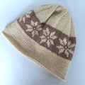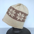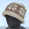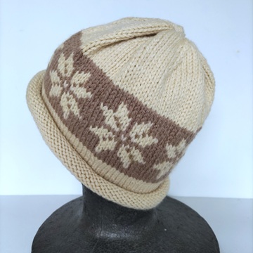 アースカラーで雪の結晶をぐるりと編み込みました。 地色と雪の結晶はナラのドングリで染めた淡い砂色です。 雪の結晶の回りは山グリで染めた、スモークがかかった ような優しい茶色です。 使用した毛糸はアルゼンチンメリノ種という羊の肌触りが とても柔らかでチクチクしないのが特徴の上質な毛糸です。 おでこの部分が締めつけられるような感じのしない編み方 にしてありますので、とても優しい被り心地の帽子です。 編み込みの部分は毛糸がが二重になっているので、 とても暖かです。 裾の丸め方で深さを調節できます。 寒い時は裾を丸めないで被ると耳がかくれてより暖かです。 |