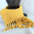 結ばないで上着を着ても気にならない、 丈の短いマフラーです。 胸元でチョコンと結ぶこともできますので、 襟元のアクセントにも使い易いです。 明るいカラシ色です。 よこ糸にループ毛糸を用いましたので、 クルンクルンした楽しい仕上がりになりました。 お出かけの時にさっと首元にかけられる、 こんな短い丈のマフラーが一枚あると、 とても重宝です。 かさばらないの丸めて手提げに入れて おけるのも嬉しいです。 扱いやすいので、ご年配の方にも大変おすすめです。 |
