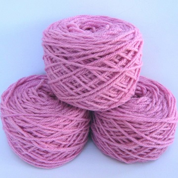 コチニールで染めました。 南米のサボテンにつくコチニールカイガラムシは 別名を臙脂虫といい、臙脂色の語源です。 雌だけが作り出す色素で、 古くは、サボテンから人の手でかき集めていたそうですが、 現在は養殖し、人工的に抽出し乾燥させています。 赤やピンク色のお菓子などの成分を見ると必ずコチニールの文字が 入っていますのでご覧になってみてください。 毛糸もその乾燥させたものを使って染めます。 やや濃色の、大人っぽいスモーキーなピンクです。 |